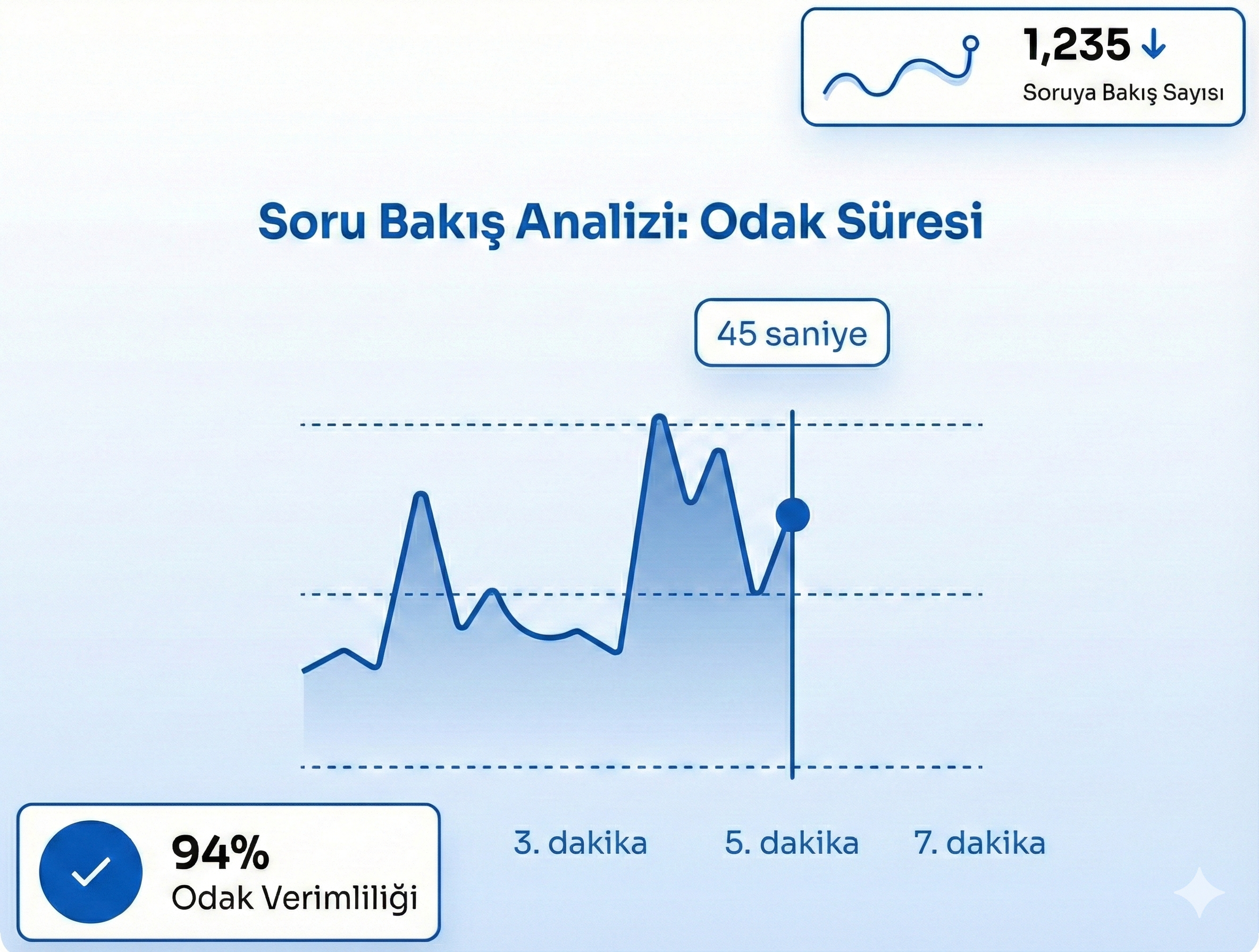 Sınav boyunca hangi soruya ne kadar odaklandığınızı ve dikkatinizi dağıtan unsurları bakış analizi teknolojisiyle tespit edin.